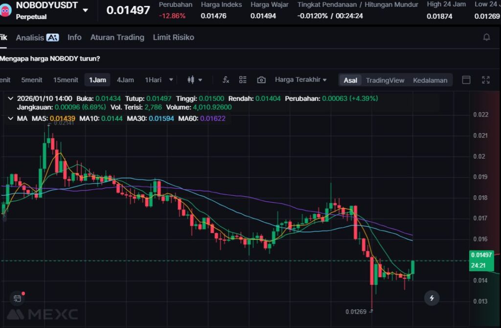 NOBODY terkoreksi -18.10% ke harga $0.0140. Koreksi seperti ini cukup umum pada memecoin karena pergerakannya sangat dipengaruhi oleh sentimen komunitas dan arus momentum.