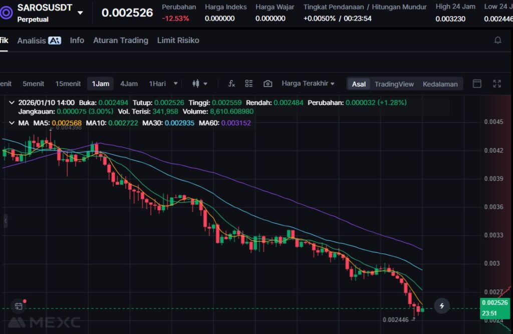 SAROS turun -13.19% dan diperdagangkan di $0.0025. Koreksi ini menandakan tekanan jual yang cukup terasa, meski narasinya berasal dari ekosistem “super app” Web3 di Solana.