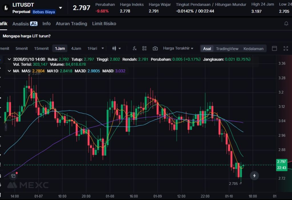 LIT melemah -11.72% ke harga $2.732. Walau penurunannya paling kecil di daftar losers, koreksi dua digit tetap menunjukkan tekanan jual yang cukup konsisten pada sesi berjalan.