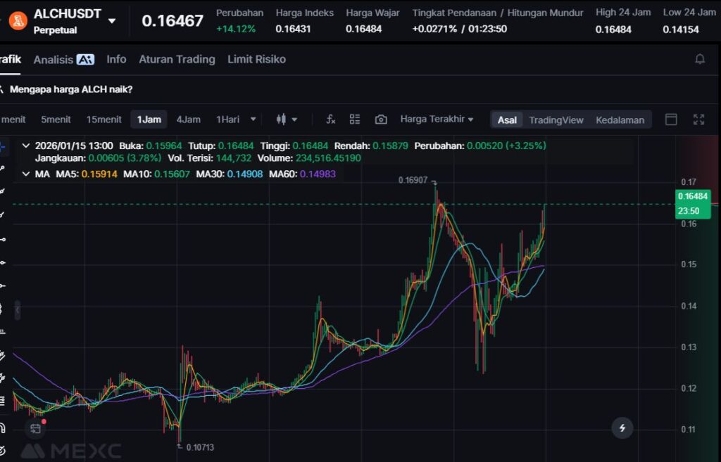Kenaikan +10.23% menunjukkan ALCH masih berada dalam radar pasar, terutama karena narasi AI + no-code yang terus berkembang di dunia Web3.