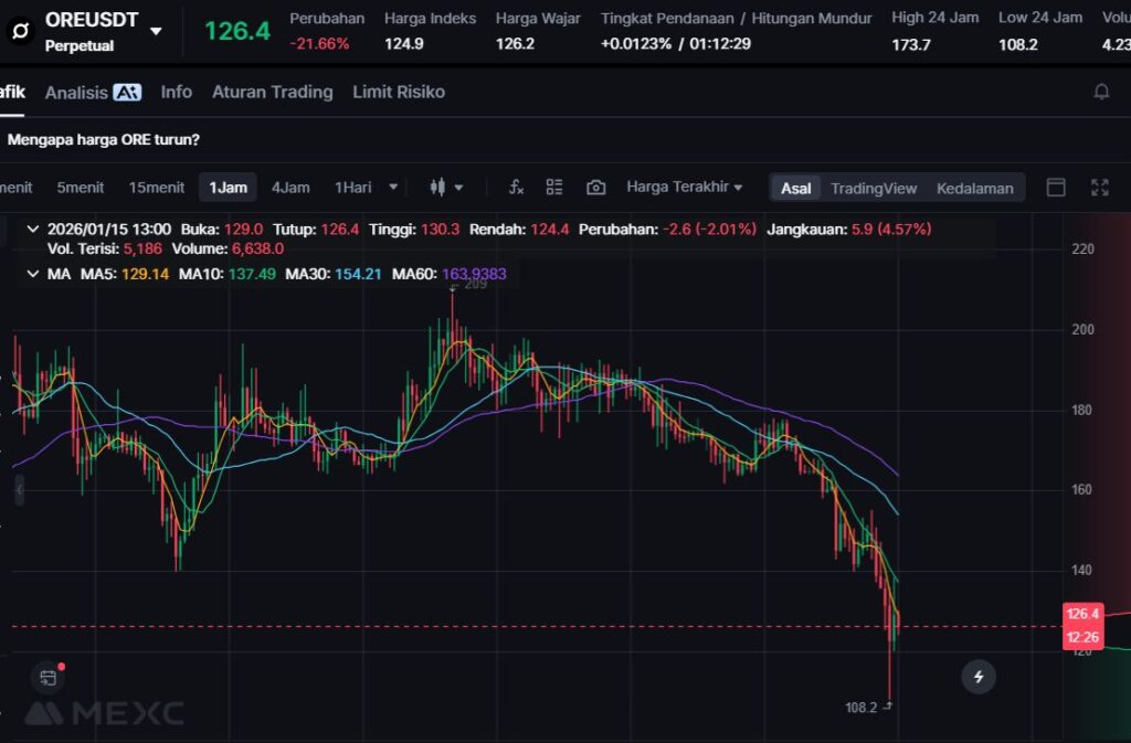 Turun -24.33%, ORE mengalami koreksi signifikan, menandakan pergeseran sentimen pasar atau aksi ambil untung dari pergerakan sebelumnya.