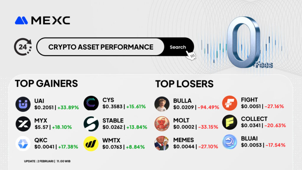 Pergerakan market pada 2 Februari 2026 menunjukkan dominasi token infrastruktur dan utilitas jaringan di sisi top gainers, dengan $UAI, $MYX, dan $QKC menjadi sorotan utama. Sementara itu, tekanan terbesar masih terjadi pada token meme dan komunitas, menandakan market semakin selektif dalam memilih narasi.