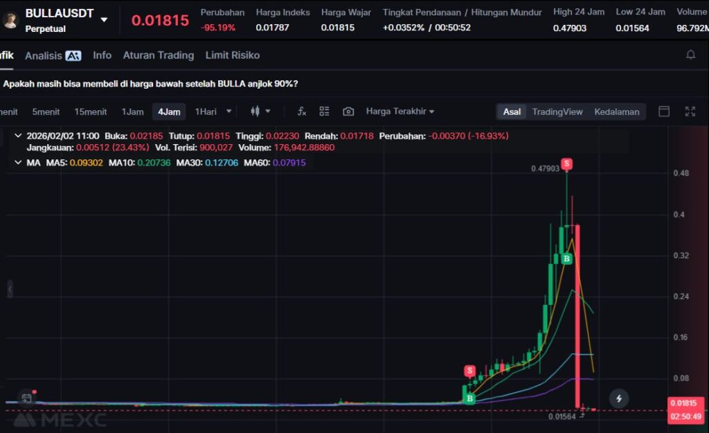 $BULLA mengalami koreksi tajam setelah volatilitas ekstrem. Penurunan ini mencerminkan tekanan jual besar pada token komunitas berbasis meme setelah hype sebelumnya mereda.