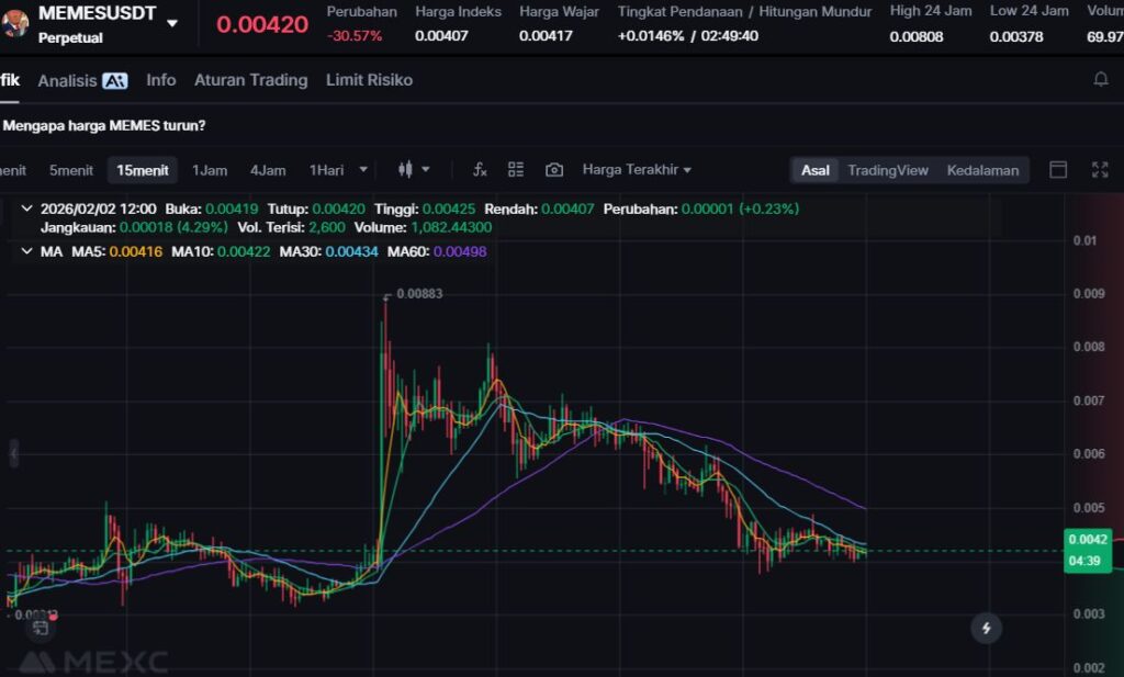 $MEMES melemah tajam setelah reli sebelumnya. Koreksi ini mencerminkan karakter market meme coin yang sangat sensitif terhadap sentimen jangka pendek.
