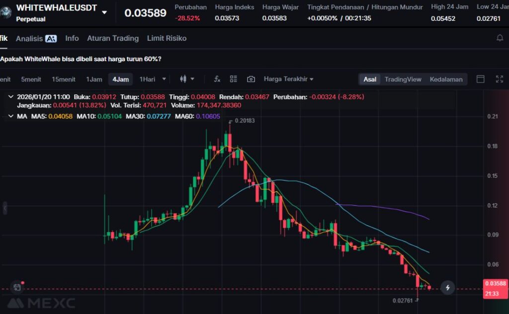 WHITEWHALE kembali terkoreksi seiring melemahnya momentum pada token komunitas. Penurunan ini menunjukkan tingginya sensitivitas token meme terhadap perubahan sentimen pasar.