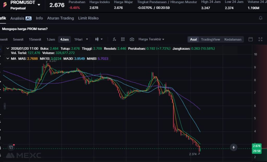 PROM terkoreksi lebih dari 16% seiring tekanan pasar pada token Layer-2. Penurunan ini terjadi di tengah rotasi modal ke aset dengan volatilitas lebih tinggi.