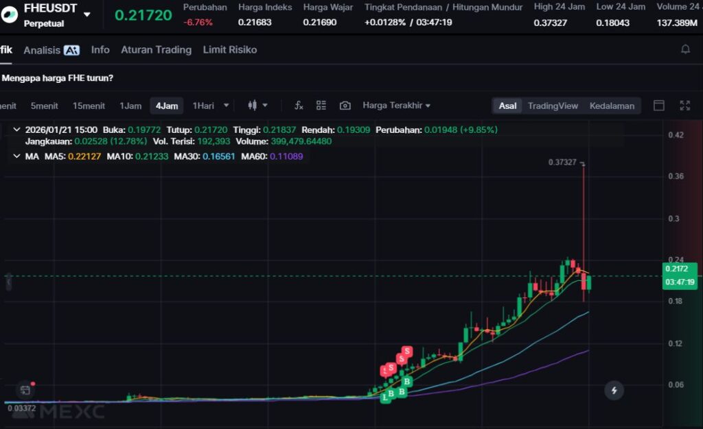 FHE mengalami kenaikan +19.02%, didukung oleh sentimen positif terhadap proyek infrastruktur privasi dan AI. Pasar merespons kuat narasi keamanan data dan zero trust yang semakin relevan di era AI.