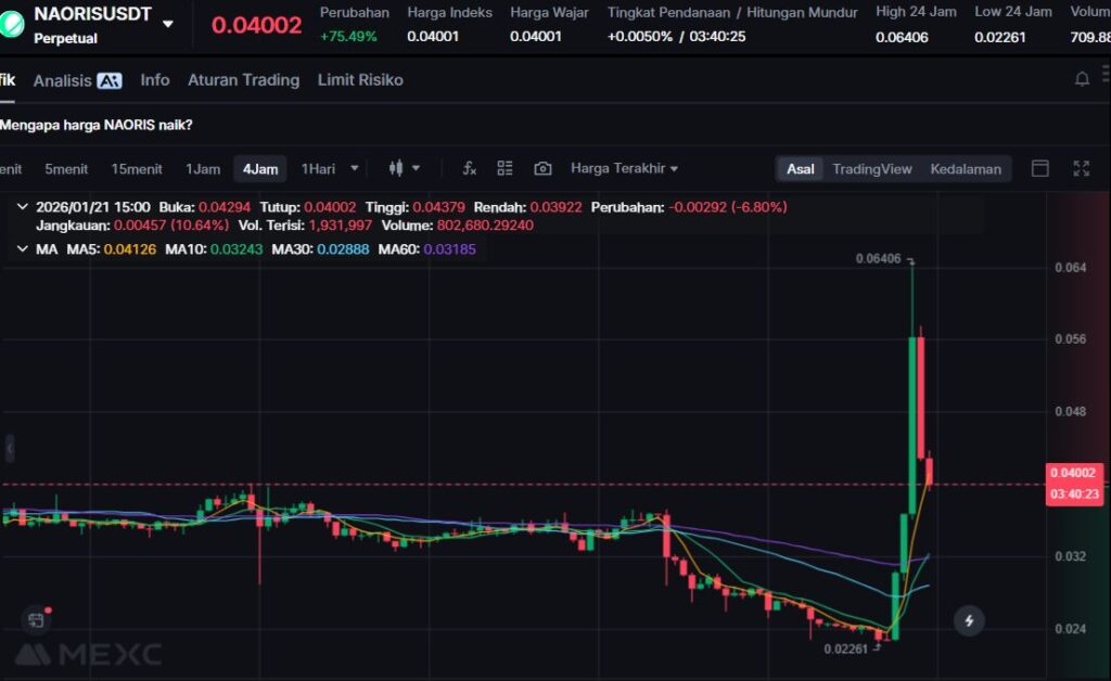 NAORI mencatatkan lonjakan harga signifikan sebesar +132.35% dalam 24 jam terakhir, menjadikannya top gainer hari ini di MEXC. Kenaikan tajam ini didorong oleh meningkatnya minat pasar terhadap sektor keamanan siber terdesentralisasi dan narasi post-quantum security yang kembali menguat.