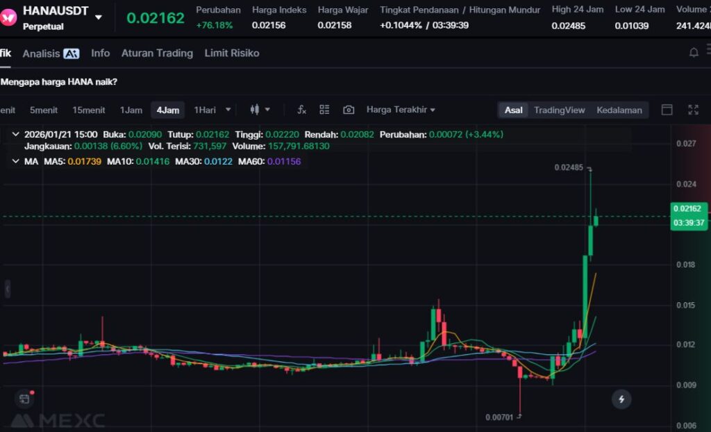 HANA mengalami kenaikan kuat sebesar +58.26%, mencerminkan kembalinya minat trader terhadap proyek Web3 yang menyasar adopsi pengguna ritel dan pasar Asia. Volume perdagangan yang meningkat mendorong pergerakan harga ke level yang lebih tinggi dalam waktu singkat.