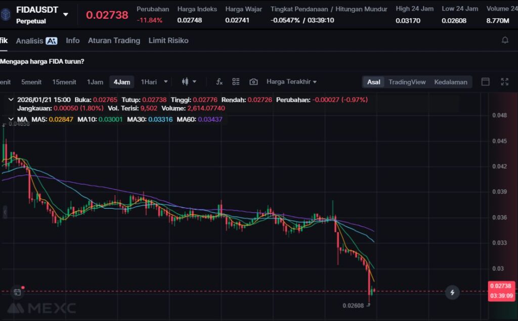 FIDA turun -13.03%, mencerminkan koreksi lanjutan setelah volatilitas tinggi di sektor infrastruktur Solana.