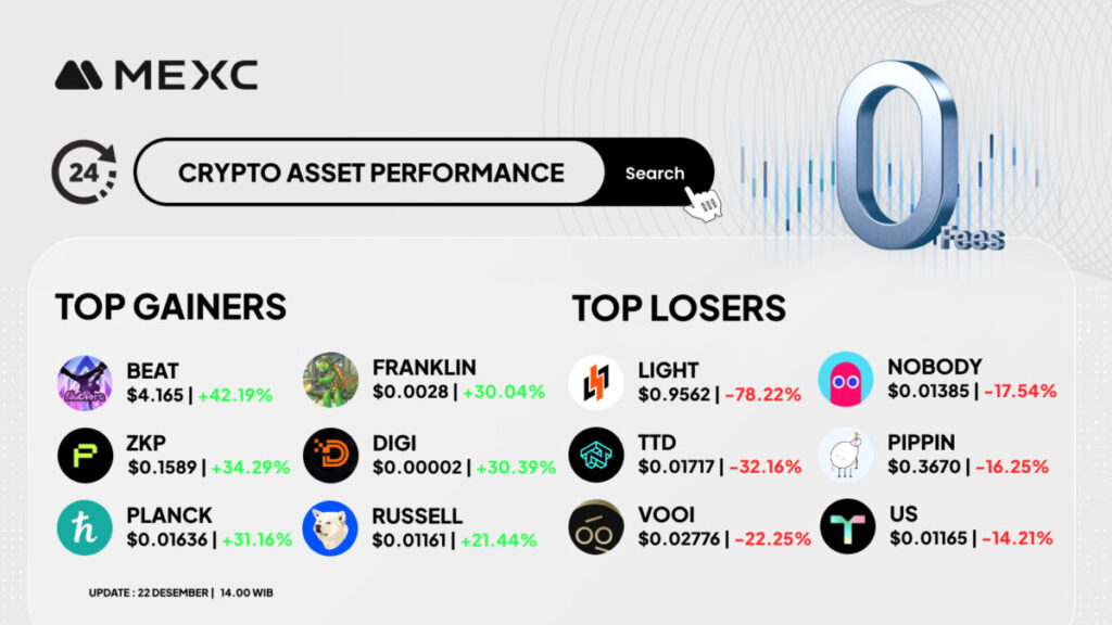 Market kripto pada 22 Desember 2025 mencatat pergerakan yang kembali volatil menjelang akhir tahun. Namun, sejumlah altcoin berhasil tampil kuat dan memimpin penguatan, terutama token berbasis AI, musik, DePIN, hingga memecoin yang ditopang komunitas besar. Lonjakan ini menandakan bahwa sektor-sektor tersebut masih menjadi pusat perhatian trader.