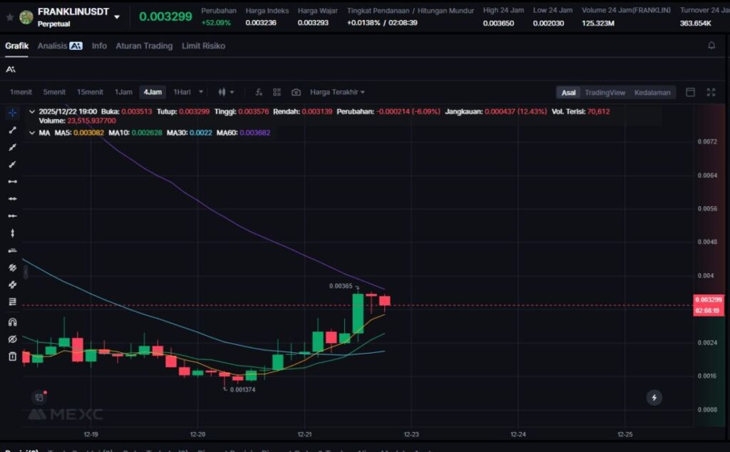 FRANKLIN naik 30.04% setelah volume trading di ekosistem AI-DeFi meningkat pesat. Token ini termasuk yang paling volatil dan banyak diperjualbelikan oleh komunitas Solana.