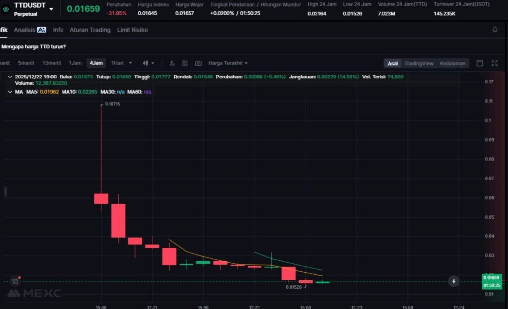 TTD turun 32.16% akibat koreksi lanjutan dari platform AI-agent trading yang sebelumnya mengalami kenaikan signifikan.