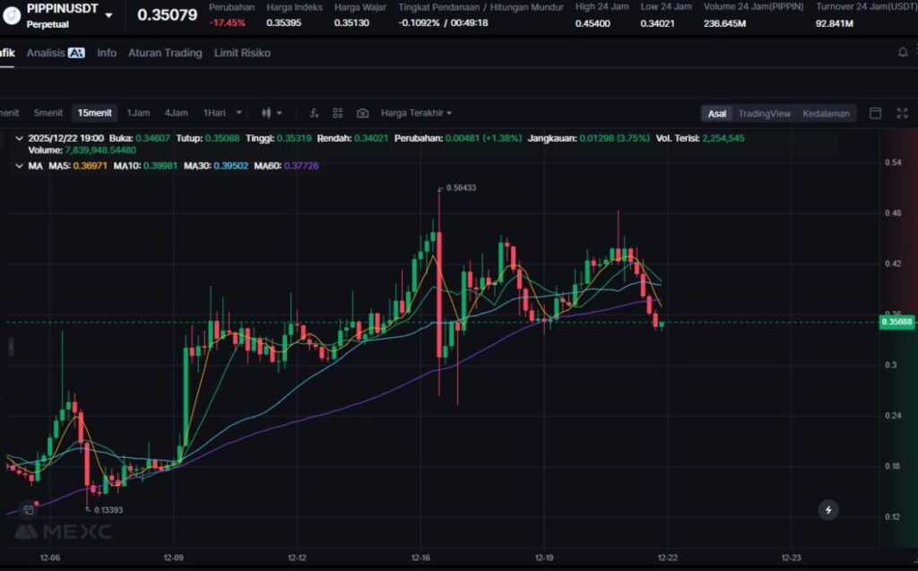 PIPPIN melemah 16.25% akibat penurunan volume pada sektor AI-Agent Meme yang sedang cooling-off.
