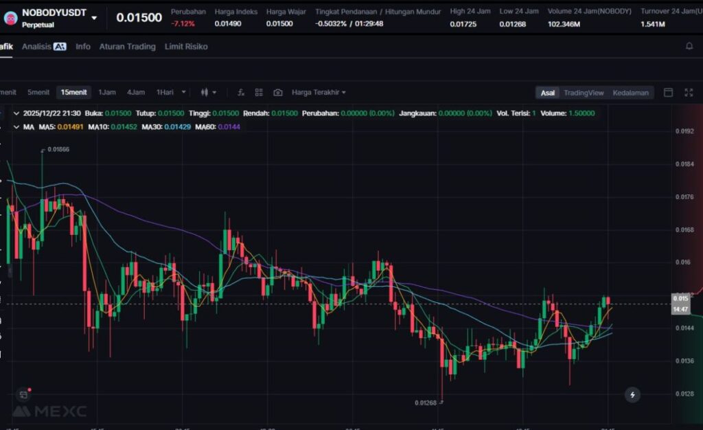 NOBODY turun 17.54% setelah lonjakan beberapa hari sebelumnya. Koreksi ini sifatnya wajar untuk memecoin yang digerakkan komunitas.