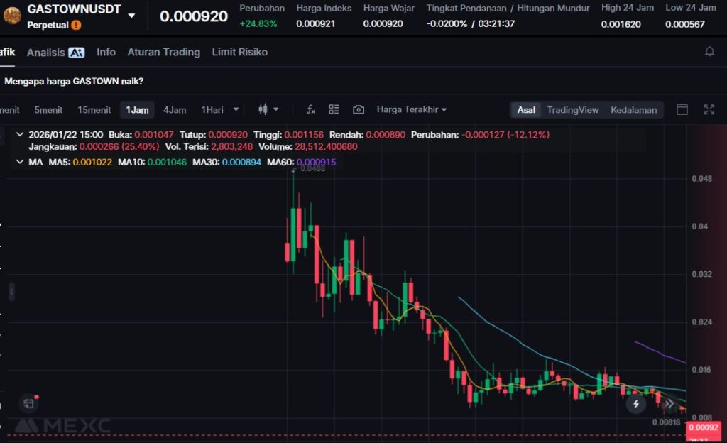 GASTOWN mengalami kenaikan +60.10%, melanjutkan volatilitas tinggi yang sering terlihat pada aset berkapitalisasi kecil. Kenaikan ini dipicu oleh aktivitas spekulatif jangka pendek dan lonjakan volume perdagangan.