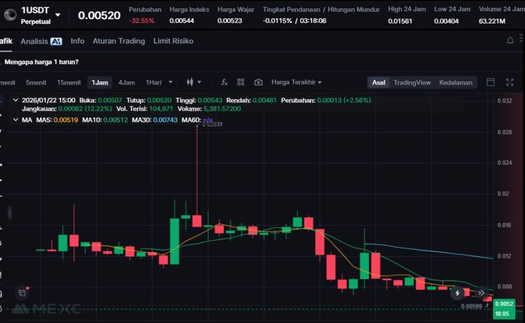 Token 1 mengalami penurunan tajam sebesar -34.24%, menjadi top loser hari ini akibat tekanan jual yang kuat dan minimnya sentimen pendukung.