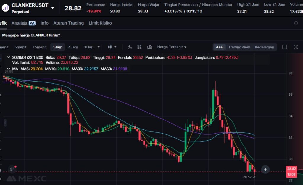 CLANKER melemah -19.31%, menunjukkan koreksi setelah aktivitas tinggi pada ekosistem Base dan proyek token-launching berbasis sosial.