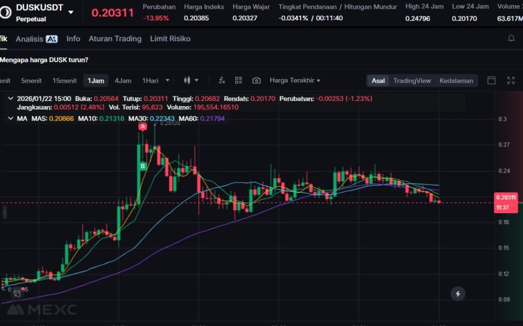 DUSK turun -10.14%, mengalami koreksi setelah reli sebelumnya di sektor privasi dan tokenisasi aset dunia nyata.