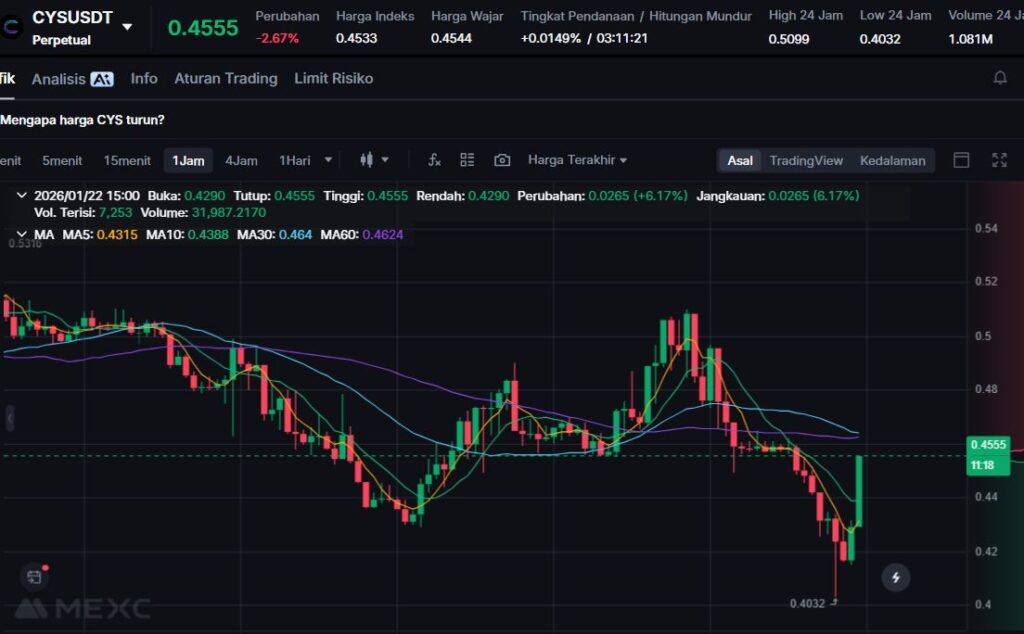 CYS terkoreksi -9.91%, seiring melemahnya minat jangka pendek pada proyek ComputeFi dan infrastruktur komputasi terdesentralisasi.