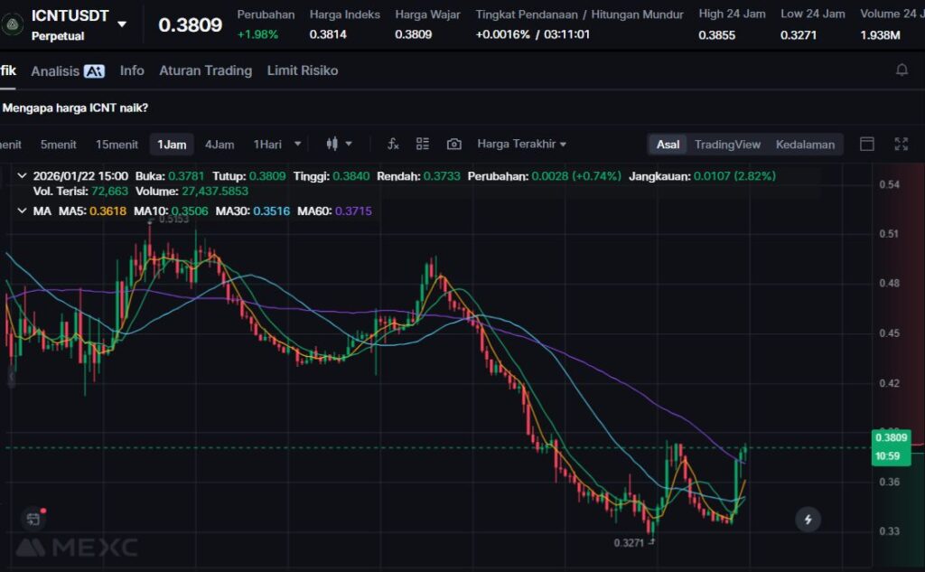 ICNT turun -9.87%, mencerminkan tekanan jual moderat pada sektor DePIN dan cloud terdesentralisasi.