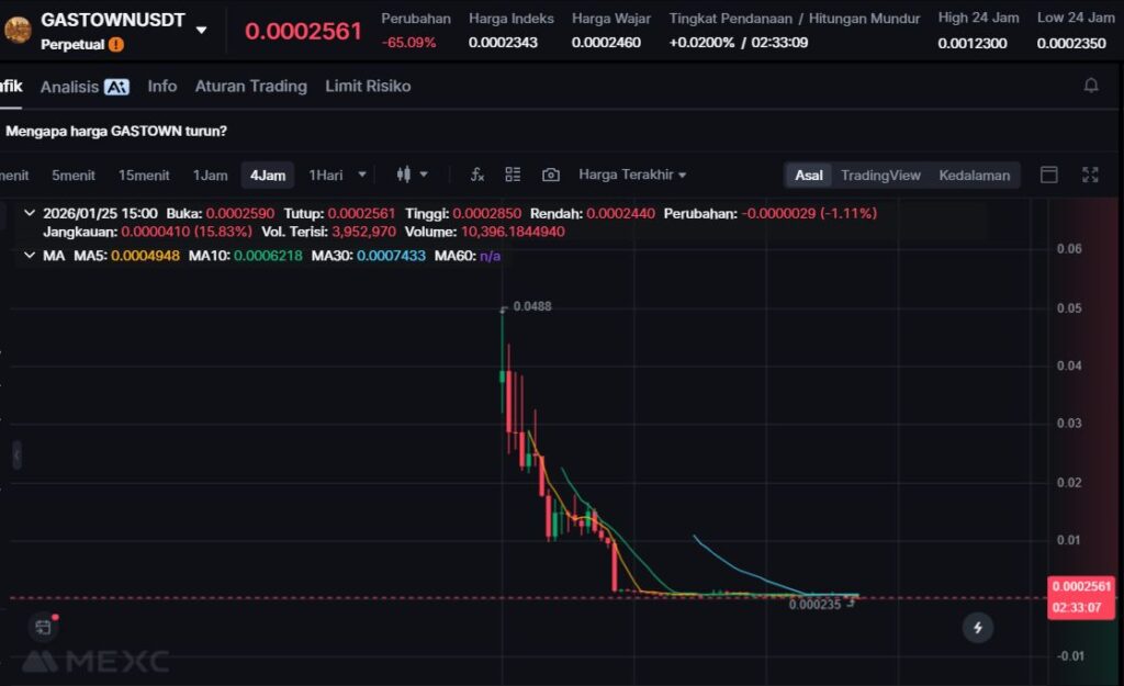 $GASTOWN mengalami penurunan tajam -57.20%, menunjukkan tekanan jual besar setelah fase spekulatif sebelumnya.