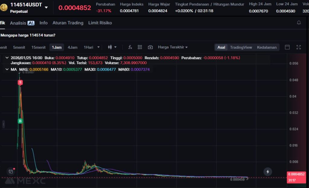 $114514 turun -24.26%, melanjutkan fase koreksi setelah lonjakan ekstrem berbasis budaya internet Jepang.