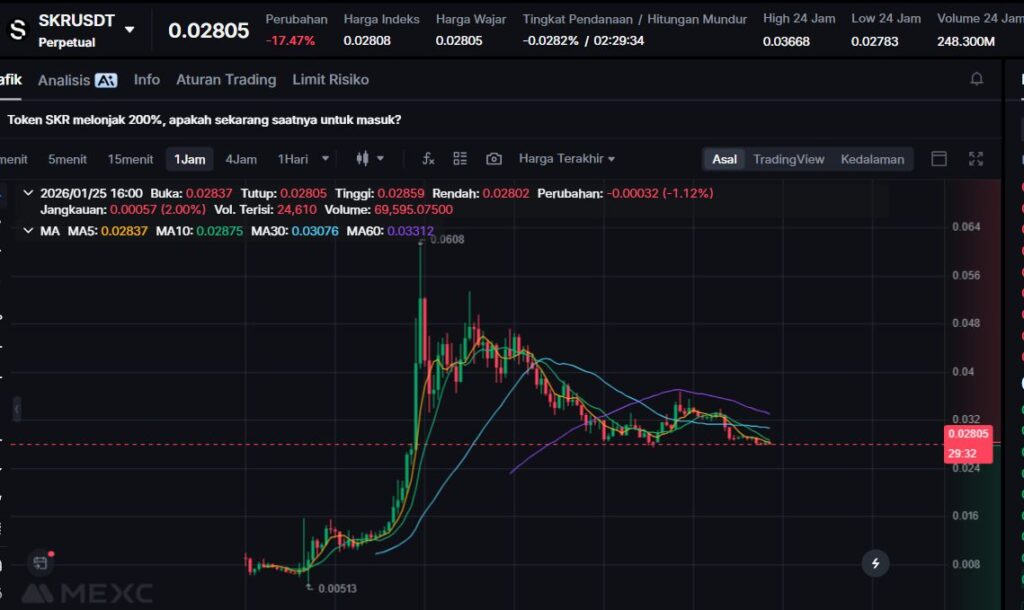$SKR turun -14.09%, mengikuti pelemahan sentimen terhadap token ekosistem mobile setelah fase distribusi awal.