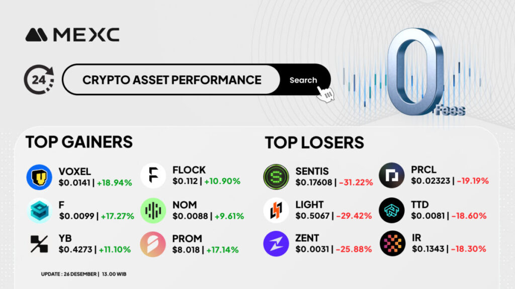 Market kripto pada 26 Desember 2025 bergerak variatif menjelang penutupan akhir tahun. Beberapa aset berhasil mencatatkan penguatan stabil didorong oleh narrative gaming, AI, dan DeFi baru yang mulai menunjukkan pemulihan. Sementara itu, token-token yang sebelumnya mengalami reli cukup besar justru memasuki fase koreksi sehat.
