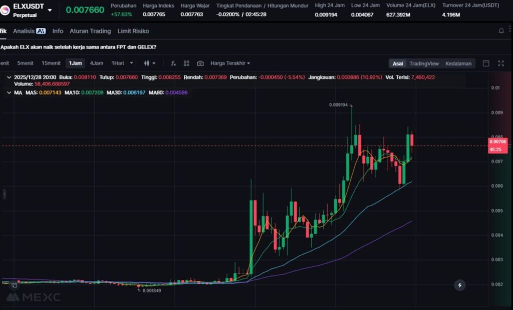 ELX memimpin perolehan hari ini dengan lonjakan 56.79%. Peningkatan ini dipicu oleh naiknya volume pada sektor modular chain yang kembali menarik perhatian investor menuju akhir Desember.