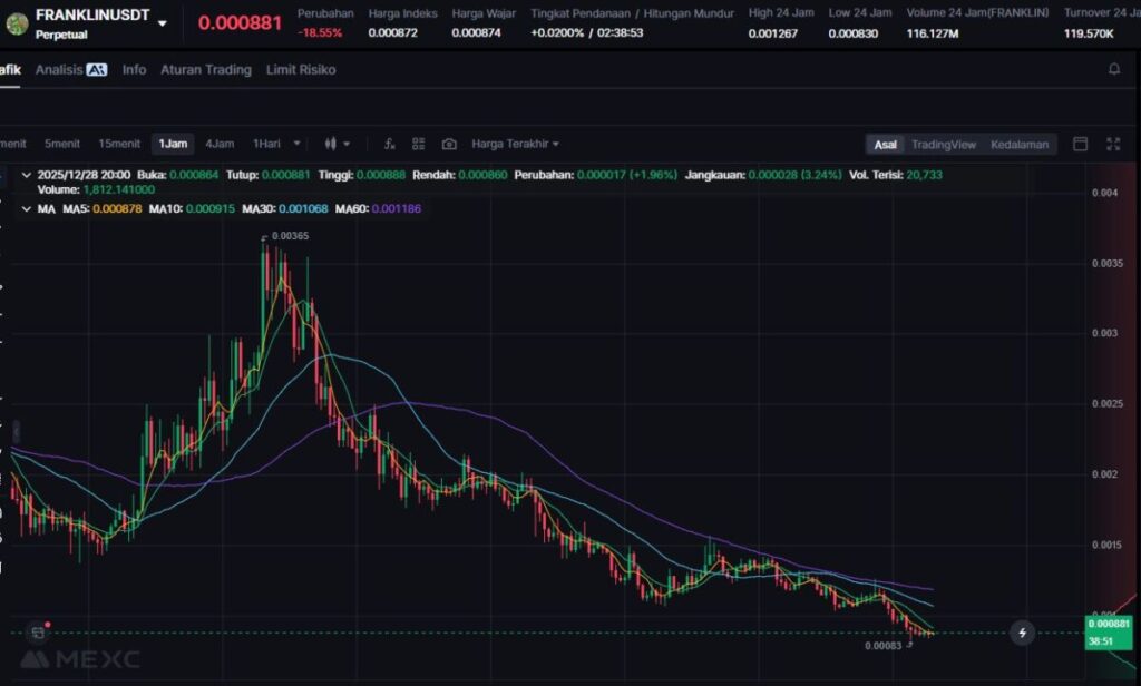 FRANKLIN turun 9.51% mengikuti pelemahan memecoin Solana dalam beberapa hari terakhir.