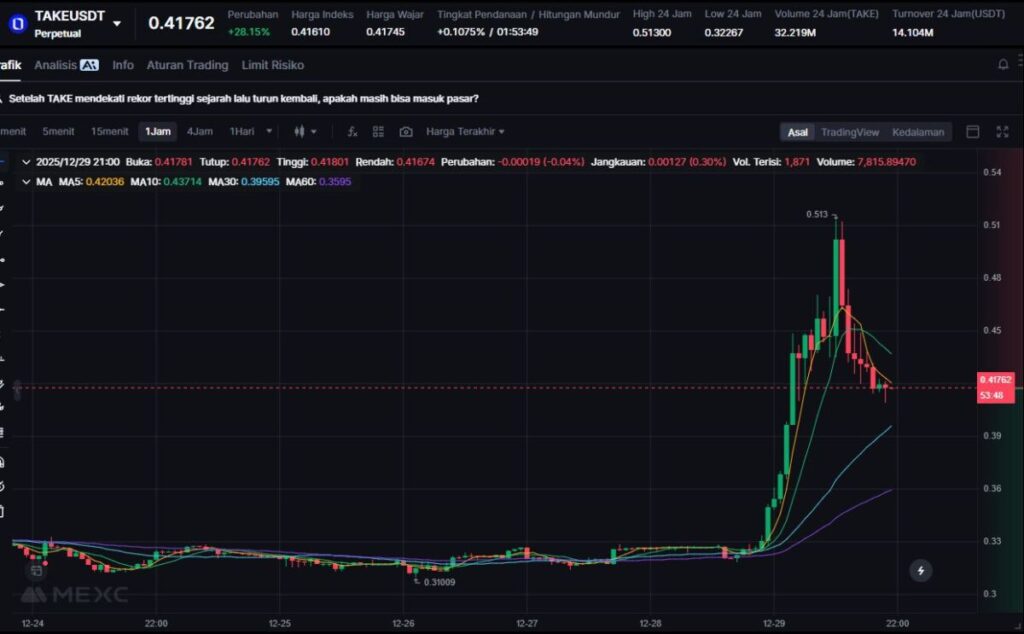 TAKE naik hampir 50% berkat tingginya minat pada sektor game dan tooling Web3. Volume beli meningkat konsisten sejak pagi.
