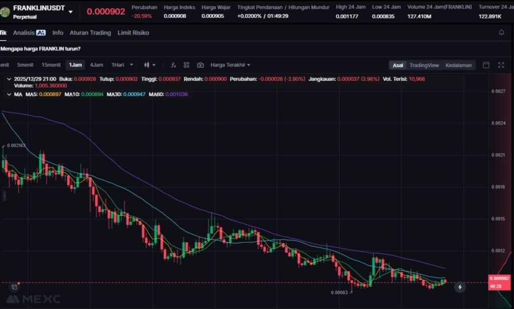 Sebagai memecoin berbasis komunitas, harga FRANKLIN banyak dipengaruhi oleh hype dan aktivitas sosial, sehingga pergerakannya sangat fluktuatif.