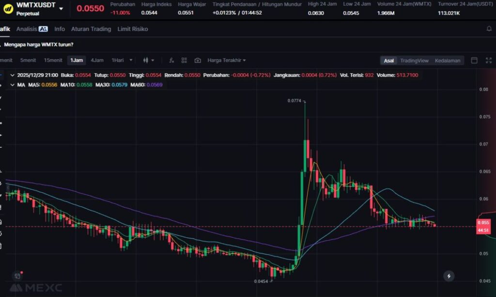 WMTX mencatat penurunan ringan sekitar 9.5%, masih dalam batas wajar untuk mid-cap token.