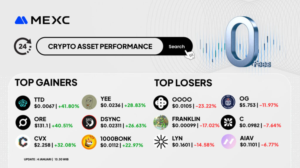 Berikut rangkuman Top Gainers dan Top Losers di MEXC berdasarkan pembaruan 4 Januari 2026, 13.30 WIB, dengan harga dan persentase mengikuti data pada gambar, serta penjelasan proyek berdasarkan sumber yang kamu kasih.