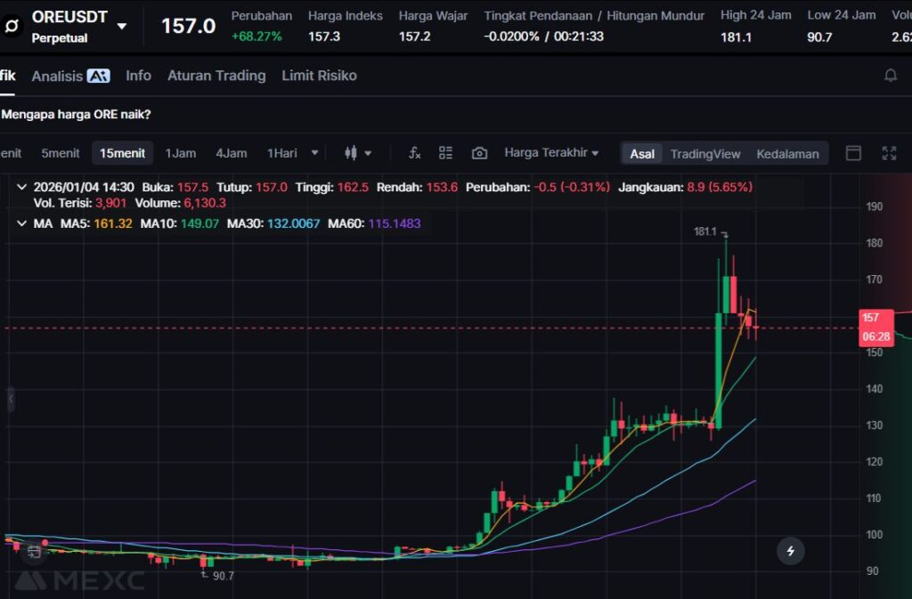 ORE menguat +40.51% ke $131.1, menjadi salah satu token dengan performa paling kuat hari ini. Pergerakan seperti ini umumnya menarik perhatian trader momentum karena range pergerakannya cukup lebar dalam periode singkat.