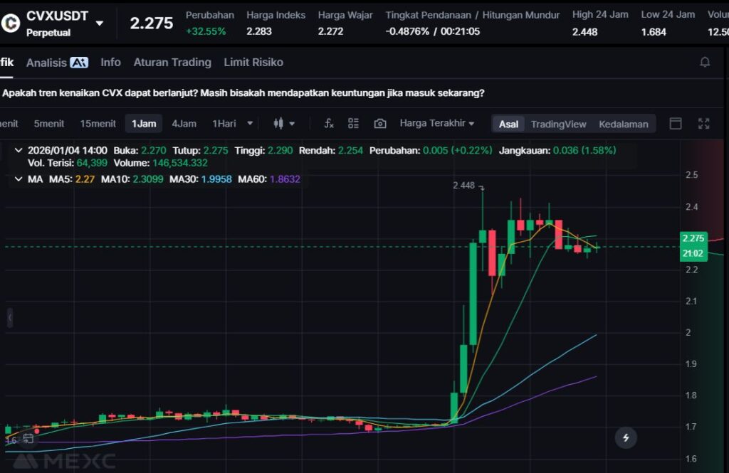 CVX naik +32.08% dan diperdagangkan di $2.258. Kenaikan ini menempatkan CVX di jajaran gainers utama hari ini, menunjukkan minat beli yang cukup solid pada sesi pembaruan ini.