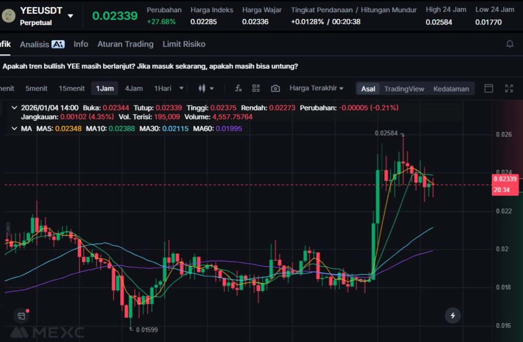 YEE menguat +28.83% ke $0.0236. Lonjakan seperti ini sering terjadi pada aset bertema komunitas/meme karena pergerakannya cepat mengikuti atensi market.