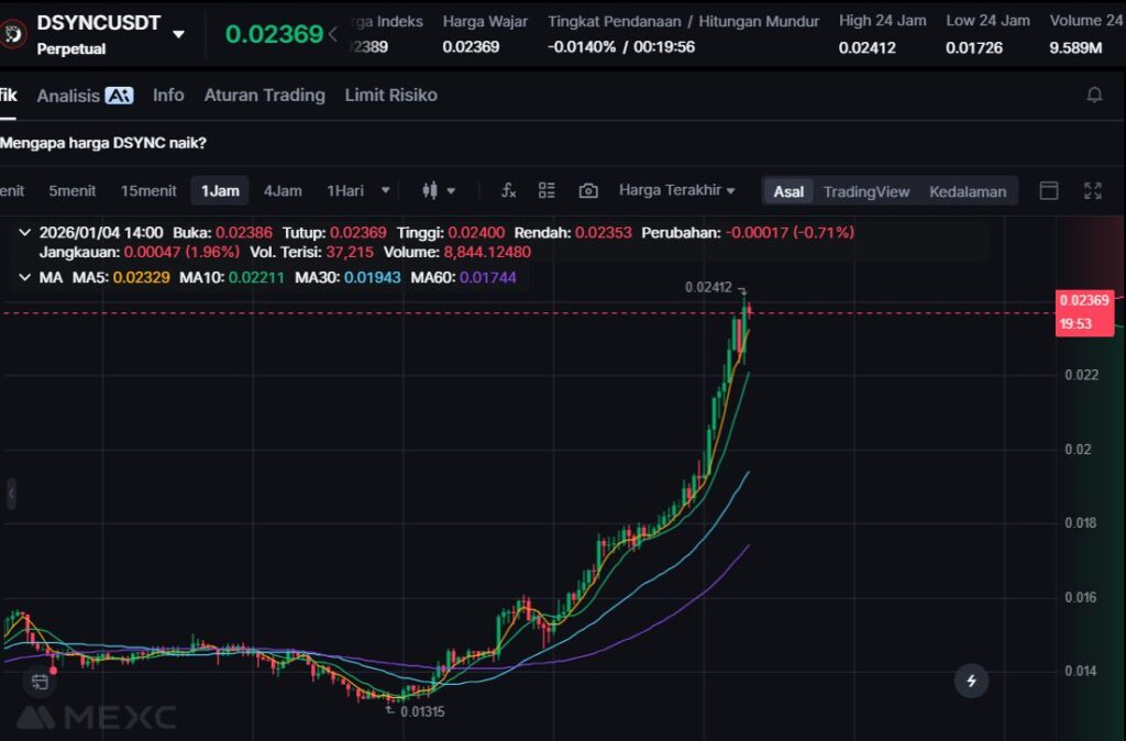 DSYNC naik +26.63% ke harga $0.0231. Kenaikan ini menunjukkan adanya dorongan beli yang cukup konsisten, terutama untuk token bertema infrastruktur yang sering diuntungkan saat narasi AI dan Web3 menguat.