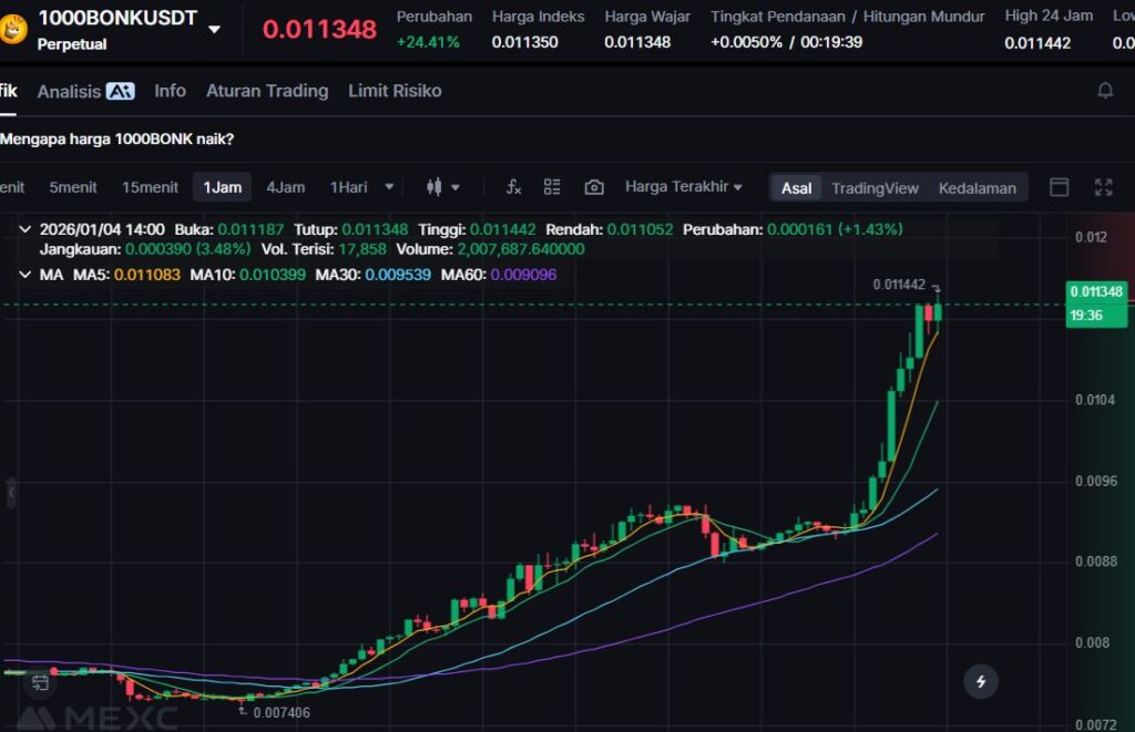 1000BONK menguat +22.97% ke $0.0112. Pergerakan dua digit seperti ini membuatnya masuk jajaran gainers hari ini, yang biasanya terjadi saat rotasi cepat ke aset meme Solana.