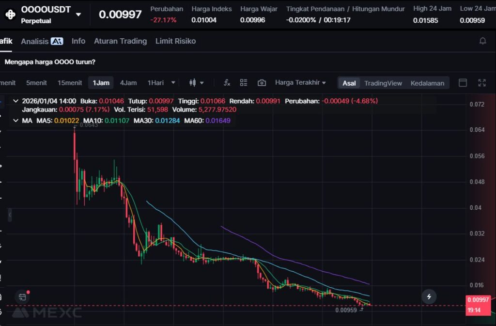 OOOO menjadi koreksi terdalam hari ini, turun -23.22% ke $0.0105. Penurunan dua digit besar biasanya menunjukkan tekanan jual yang dominan dalam periode singkat, baik karena profit taking maupun pelemahan sentimen.