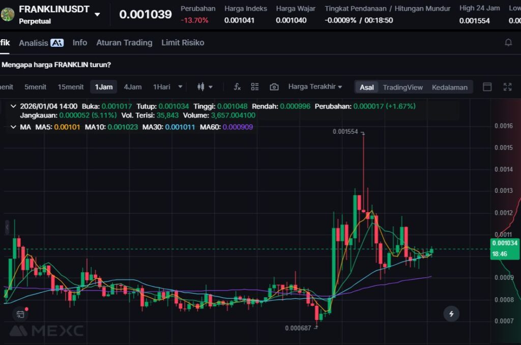 FRANKLIN melemah -17.02% ke $0.00099. Koreksi seperti ini cukup umum pada meme coin karena volatilitas tinggi, terutama saat atensi market bergeser cepat.