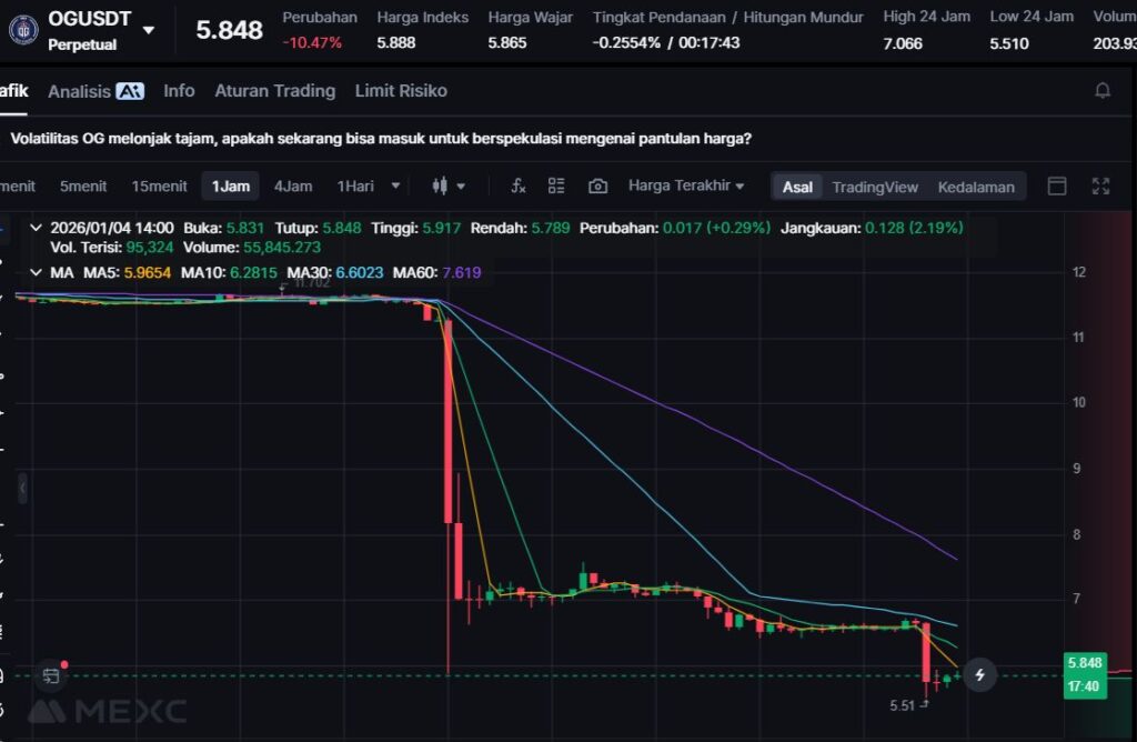 OG terkoreksi -11.97% ke $5.753. Koreksi dua digit seperti ini biasanya mencerminkan market sedang mengurangi eksposur pada aset tertentu, terutama jika likuiditas bergeser ke token yang sedang “hot”.