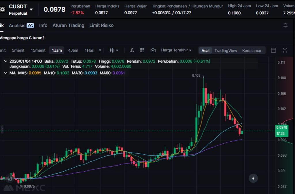 C melemah -7.64% ke $0.0982. Meski penurunannya lebih kecil dibanding tiga teratas losers, koreksi ini tetap menunjukkan tekanan jual yang cukup konsisten.