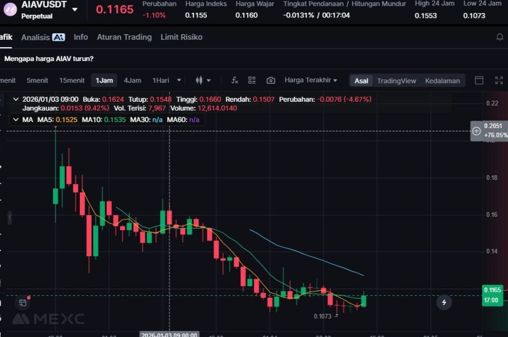 AIAV turun -6.77% ke $0.1101. Meski koreksinya paling kecil di daftar losers, pergerakan ini tetap menandakan tekanan jual dalam sesi pembaruan.