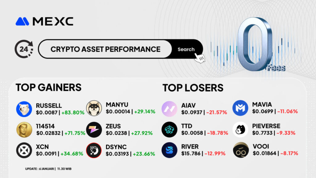 Berikut rangkuman Top Gainers dan Top Losers di MEXC berdasarkan pembaruan 6 Januari 2026, 11.30 WIB, dengan harga serta persentase mengikuti data pada gambar, dan penjelasan proyek berdasarkan source yang kamu kirim.