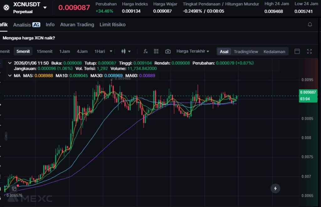 XCN menguat +34.68% ke harga $0.0091. Kenaikan ini menempatkannya di jajaran gainers utama hari ini, menunjukkan minat beli yang cukup solid pada sesi pembaruan.