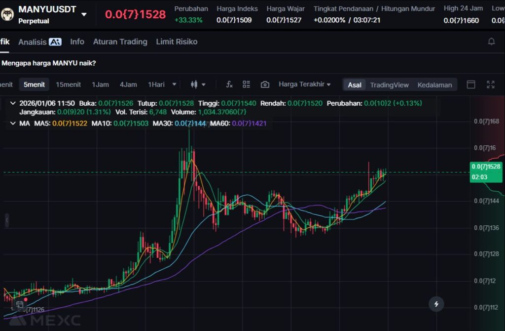 MANYU naik +29.14% dan diperdagangkan di $0.00014. Pergerakan seperti ini cukup umum pada memecoin, karena sangat dipengaruhi oleh komunitas, tren sosial, dan rotasi atensi market.