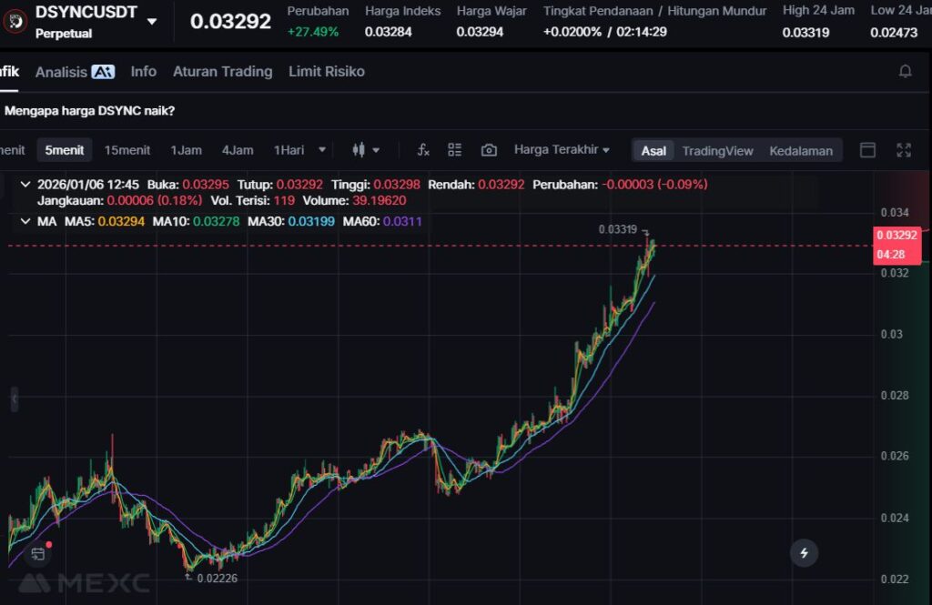 DSYNC menguat +23.66% ke harga $0.03193. Kenaikan ini menunjukkan dorongan beli yang masih cukup kuat, terutama karena narasi infrastruktur AI dan DePIN sering ikut bergerak saat market kembali agresif.
