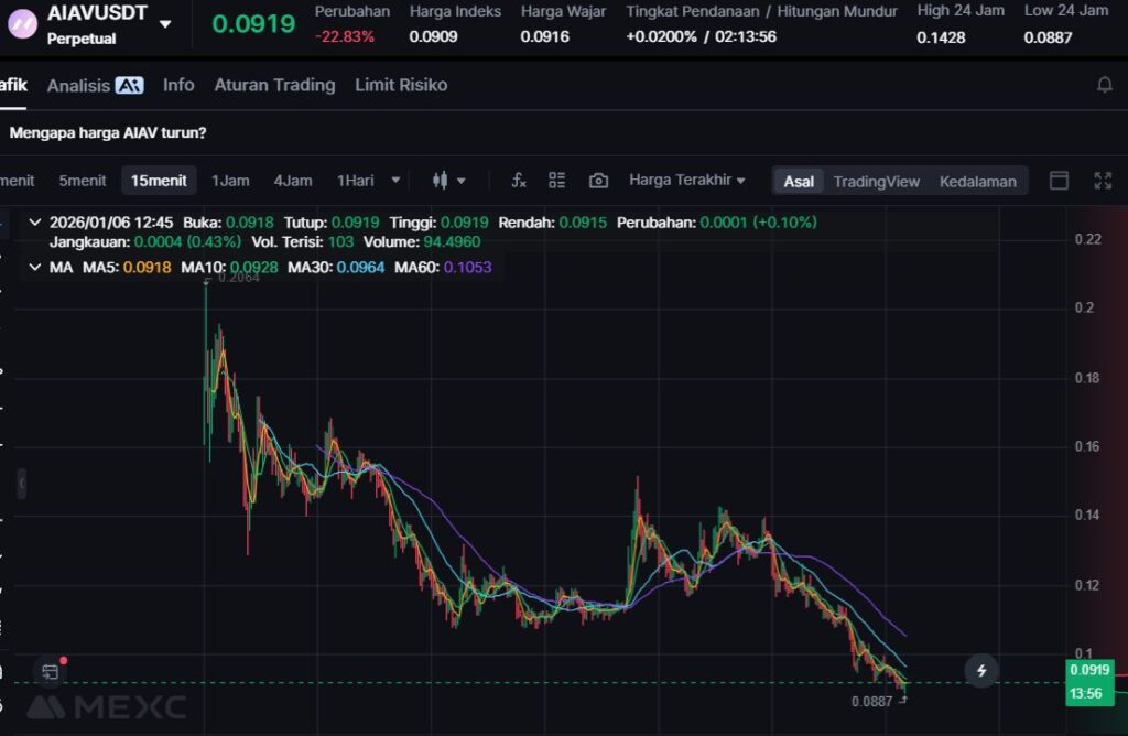 AIAV menjadi koreksi terdalam hari ini, turun -21.57% ke $0.0937. Penurunan dua digit seperti ini biasanya menunjukkan tekanan jual yang dominan pada periode pembaruan, baik karena profit taking maupun perubahan sentimen.